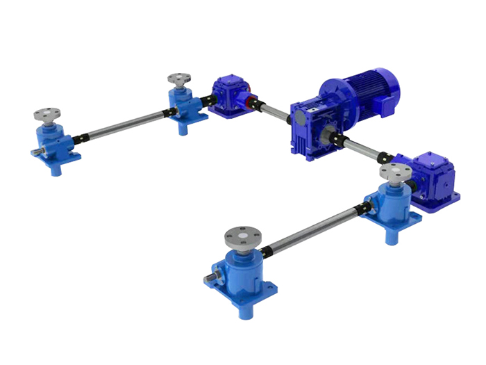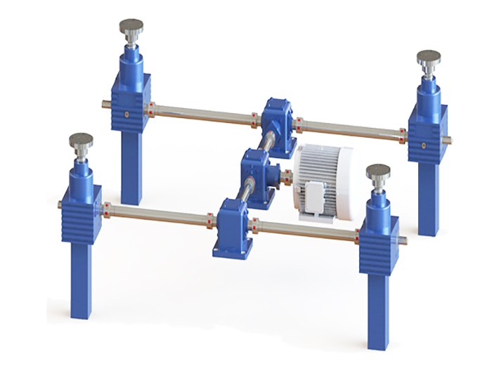 多臺聯(lián)動絲桿升降機(jī)平臺,電機(jī)在中間,電機(jī)連接轉(zhuǎn)向箱或者K系列減速機(jī),在通過連接桿和···